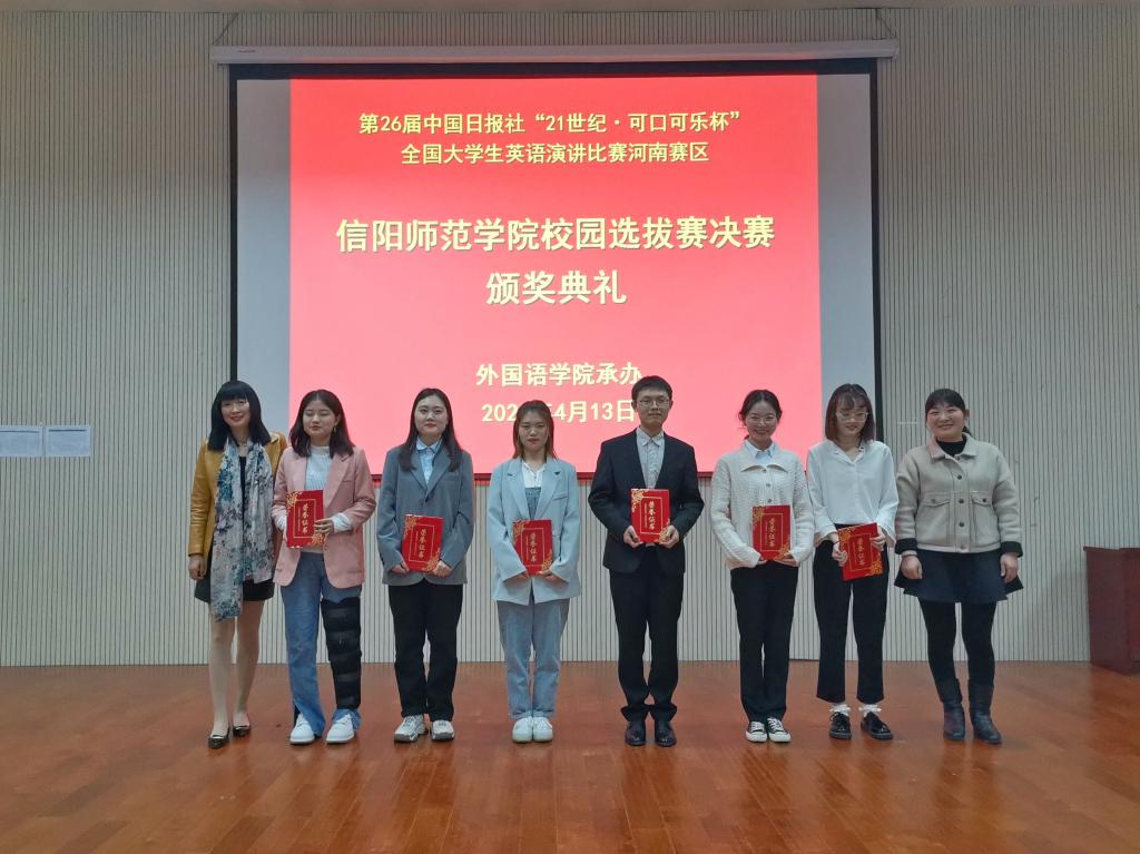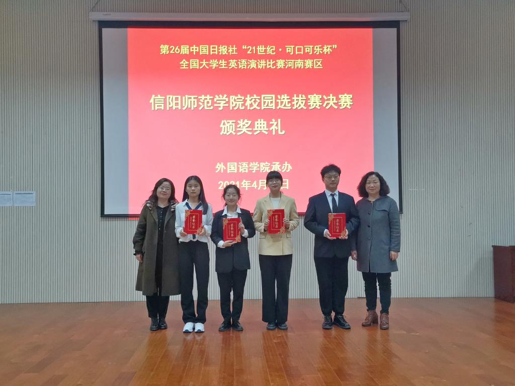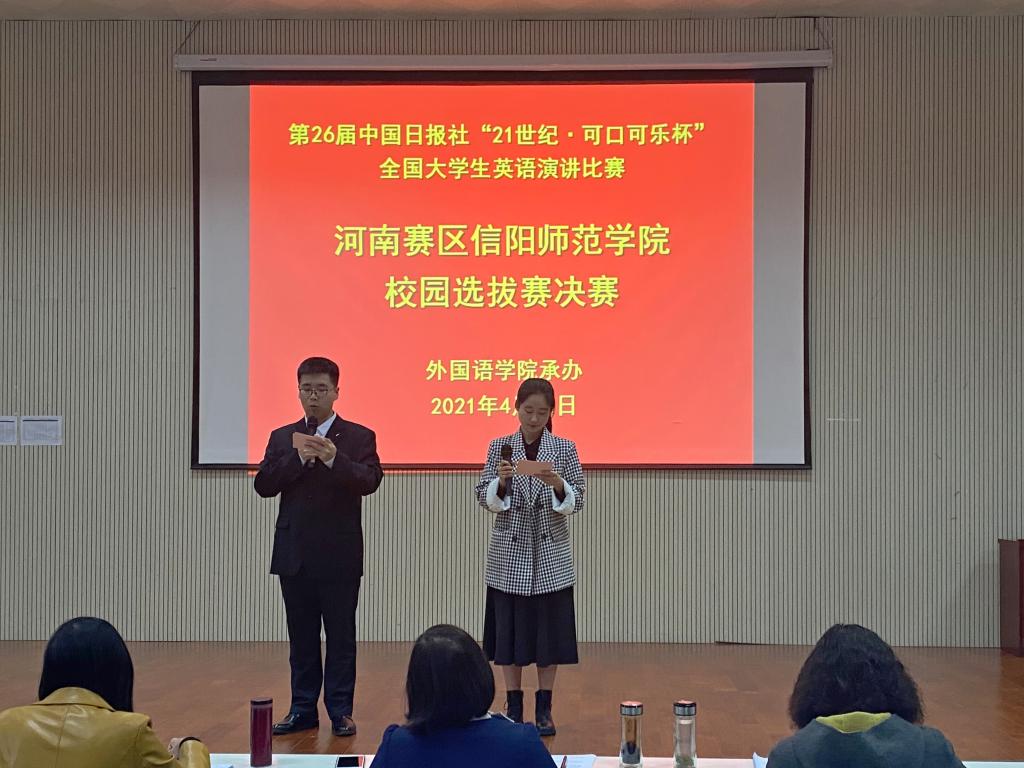4月13日下午,由伟德BV官网承办的第二十六届中国日报社“21世纪可口可乐杯”全国老员工英语演讲比赛河南赛区信阳师范公司校园选拔赛决赛于人文楼报告厅圆满落幕。伟德BV官网副经理姚光金、教师代表宣军磊、李明晔、余运伟、杨红、陈顺黎、任芳、余永锋、宋冬梅、张倩担任评委,近三百名师生观摩了此次比赛。