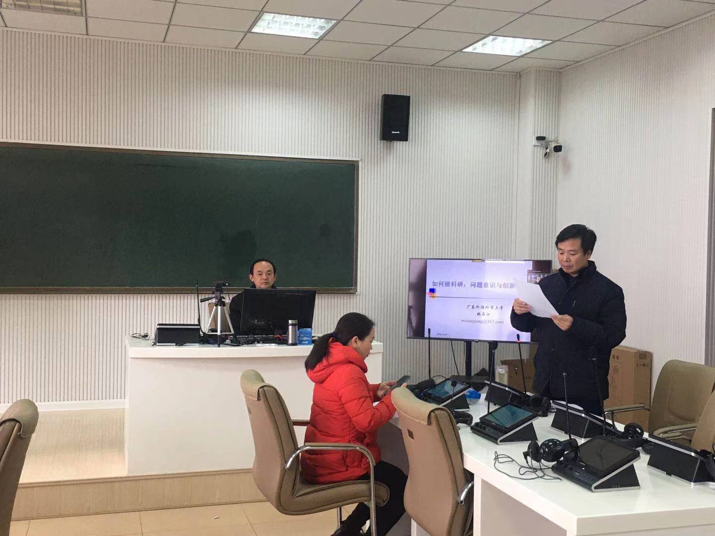 12月28日下午,魏在江在人文楼505教室作了题为“如何做科研:问题意识与创新意识”的学术报告。经理蔡满园主持报告会,公司部分教师和全体研究生共同聆听了报告。魏在江结合当前外语教学与研究的实际,围绕中国学术的独立思考及构建本土化的语言学理论、中国优秀文化如何走出去、外语研究方法论、如何正确处理教学与科研的关系等方面的话题展开论述,并结合自己的科研经历指导青年教师和研究生如何科学选择研究主题。