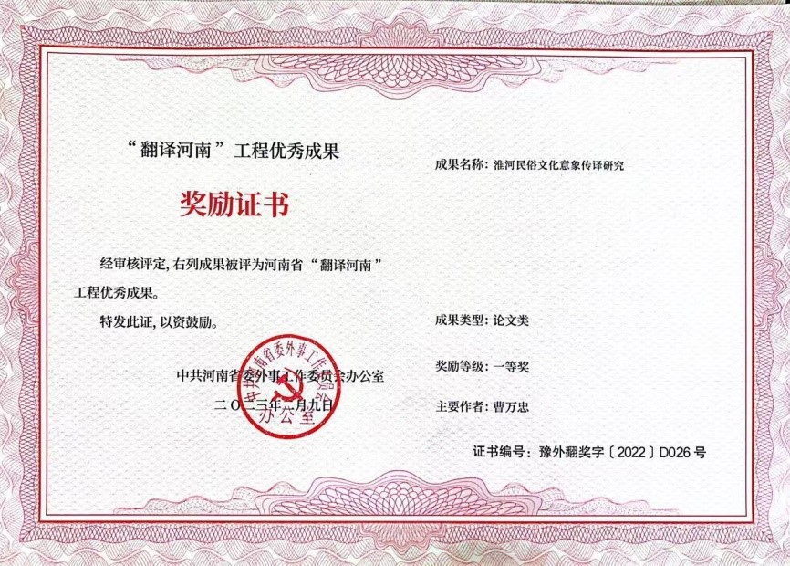 近日,中共河南省委外事工作委员会通报了2022年度“翻译河南”工程优秀成果征集情况,公司曹万忠老师的论文《淮河民俗文化意象传译研究》获得一等奖,2021级翻译硕士何琼的《翻译目的论指导下建筑物名称的翻译--以周口市关帝庙建筑为例》获得二等奖、2021级翻译硕士邹伟伟的《传播学视域下的河南作家小说海外译介与传播--以邵丽《黄河故事》英译为例》获得三等奖。