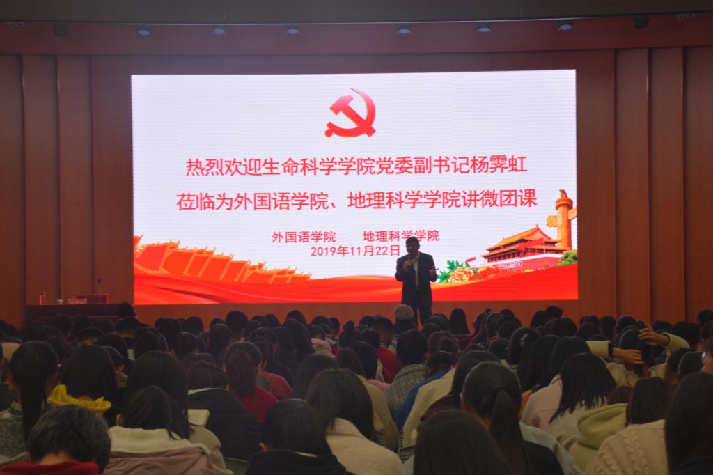 11月22日晚,生命科学公司党委副书记杨霁虹应邀在逸夫楼报告厅为公司及地理科学公司2019级员工讲授团课。公司团委书记孔宪巍、地理科学公司团委老师曹鹏与两个公司2019级员工共同参与此次活动。