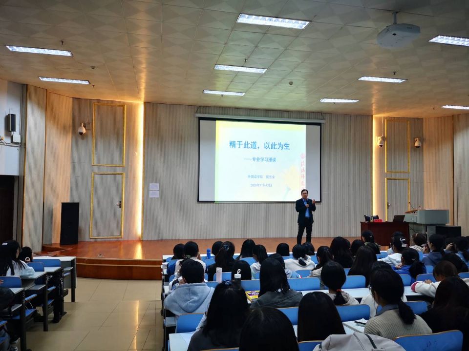 报告以“精于此道,以此为生”为题,从外语学习的必要性、外语学习中可能遇到的问题、外语学习方法三个方面展开。报告通过当今世界语言学习的发展趋势,分析了外语学习的必要性。结合同学们在语言学习中的困难和困惑,详细介绍了外语学习的技巧和方法。姚光金希望同学们在学习和生活中积极拓宽视野,了解文化差异,善用网络资源,多听多说多练,增强外语学习的自信心。报告现场气氛热烈,掌声不断。