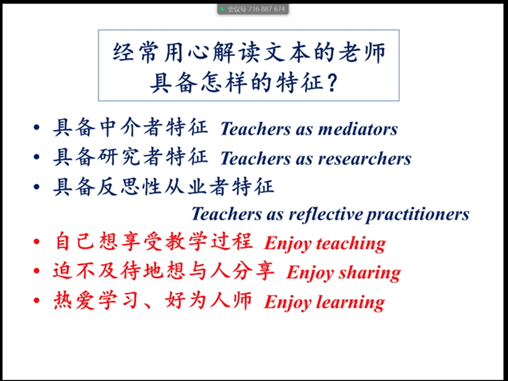 王彩琴教授以教材文本解读What-Why-How为主题,以三条贯穿始终的教学活动设计主线开展了本课的教学之旅:所至:Where(牵出When-How);所见:What(牵出Who-How);所感:How(牵连What-Where-When-Who),强调教材的最终级别为“人本”,并讲解了单元整体教学设计的几个层面。王彩琴教授提出一定要深刻理解课标内容,掌握一个总目标,三种课程类型,四种核心素养,五个基本理念,六大内容要素。在王彩琴教授这场别开生面、极具教学实践意义的远程课堂中,与会的青年教师及研究生们不仅感悟到教材的深度,也拓展了今后的教学思路,努力真正做到用心解读文本,把教学理论辅助于教学实践。