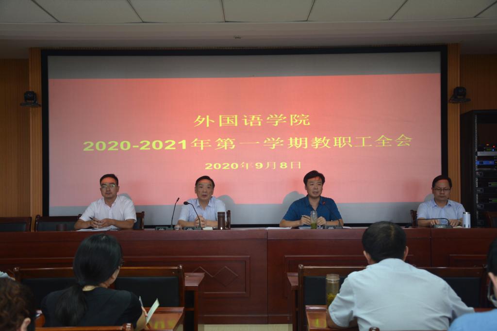 9月8日下午,伟德BV官网在人文楼六楼会议室召开2020-2021学年第一学期教职工大会。外国语公司党委书记周学红,经理蔡满园,党委副书记柏孟仁,副经理姚光金及全体教职工参加会议。会议由周学红主持。