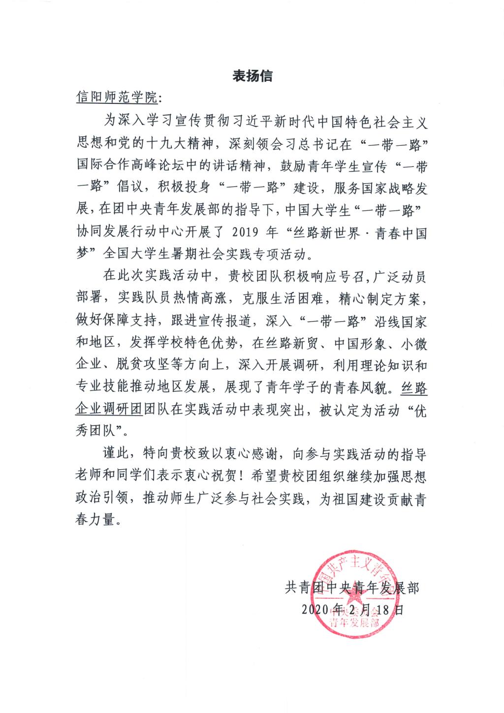 近日,公司收到共青团中央青年发展部发来的表扬信,对公司“丝路企业调研团”在中国老员工“一带一路”协同发展行动中心开展的2019“丝路新世界·青春中国梦”全国老员工暑期社会实践专项活动中的出色表现给予肯定与表扬。