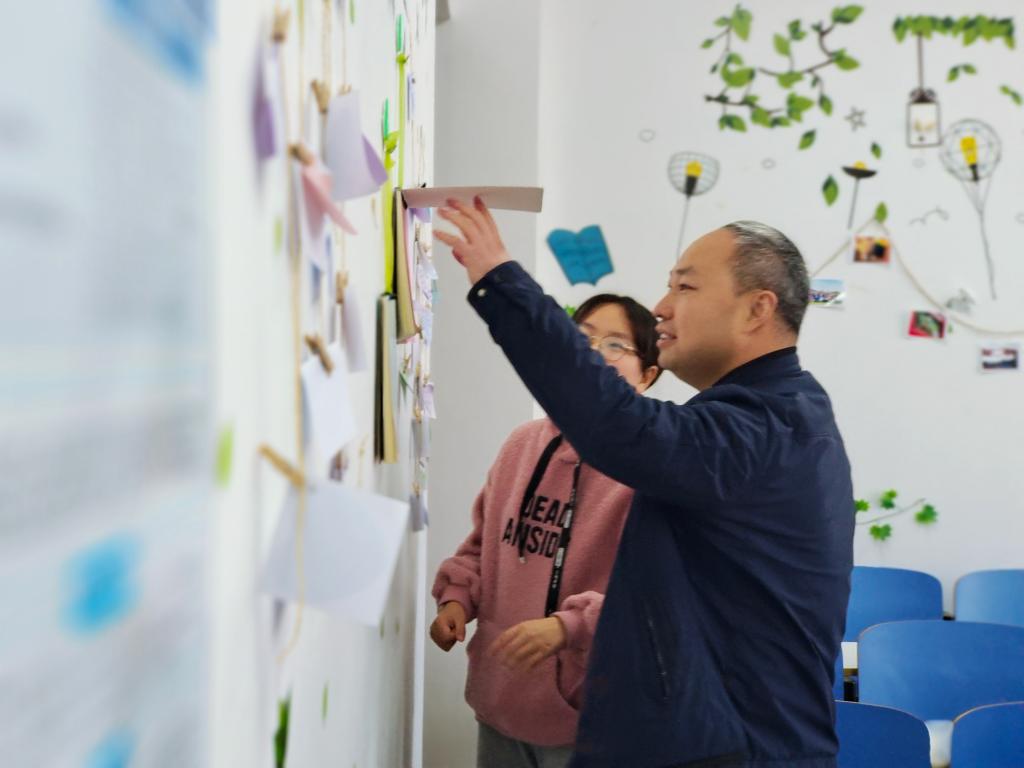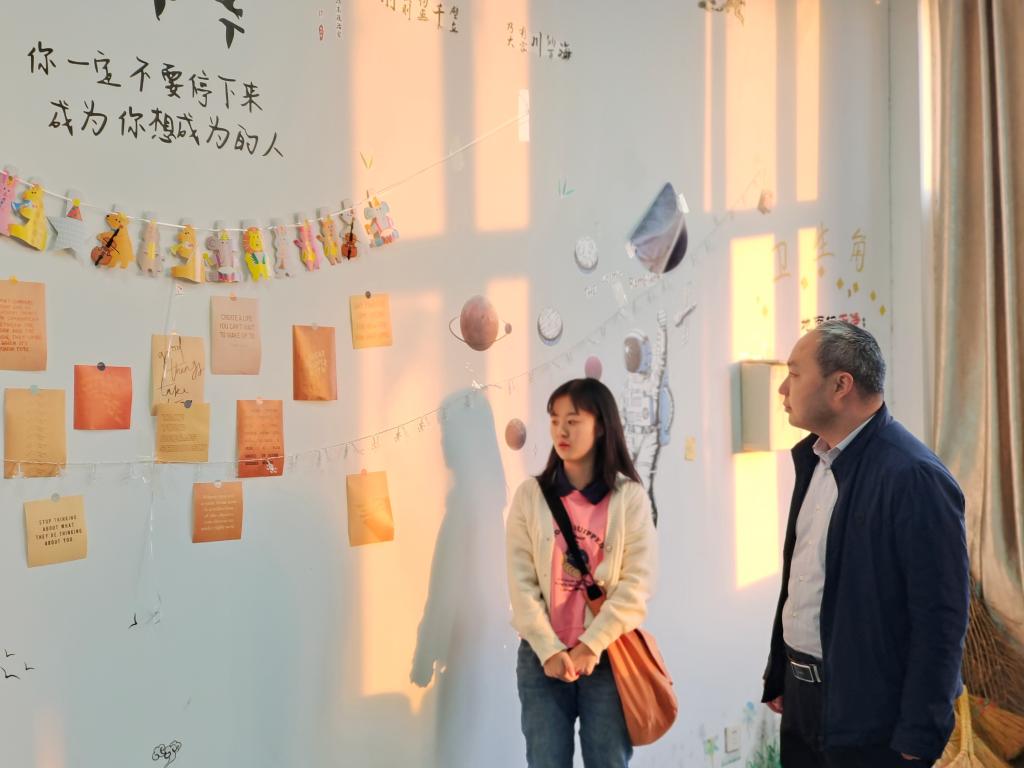 高彦伟一行边参观边与同学们深入交流。大家一致认为,班级同学集体参与心情墙设计有利于促进班级文化建设,增强班级凝聚力;设计成果很好地总结凝练了班级文化特色,营造了浓厚的班级文化氛围,既是加强班级文化建设的有效抓手,也是引导同学们合理宣泄情绪、促进健康成长的有效途径。