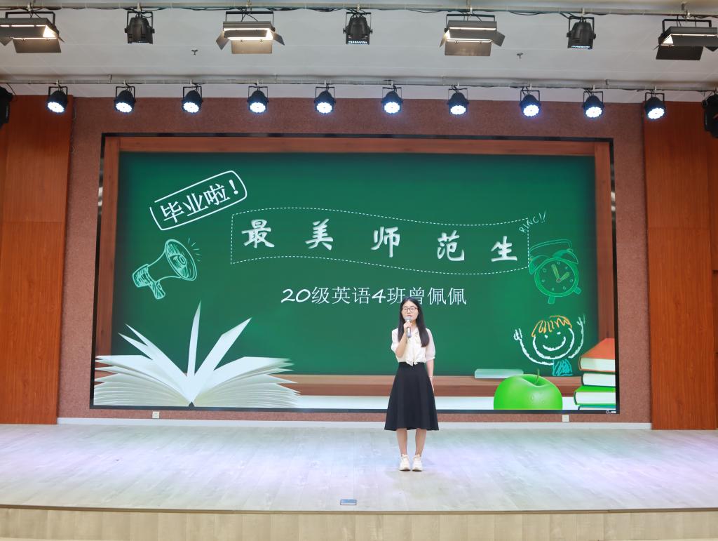 经过初赛选拔,共有8名选手进入决赛。决赛分为PPT展示和才艺展示两个环节。在PPT展示环节,参赛选手们依次从个人基本情况、专业知识学习、师范技能训练、教育实习实践、未来工作计划等方面进行汇报,仪态端庄大方、教育情怀深厚、专业知识扎实、师范技能熟练、工作计划科学,充分展现了伟德BV官网师范生的良好精神风貌和专业能力水平。在才艺展示环节,参赛选手们为现场师生带来了精彩的朗诵、歌曲、舞蹈、配音等才艺,赢得了现场观众的阵阵热烈掌声。经过激烈角逐,王宸钰、王柳元、曾佩佩、周姊涵、闫丹阳等5名同学荣获2024年“最美师范生”称号。与会领导为获奖选手颁发获奖证书并合影留念。