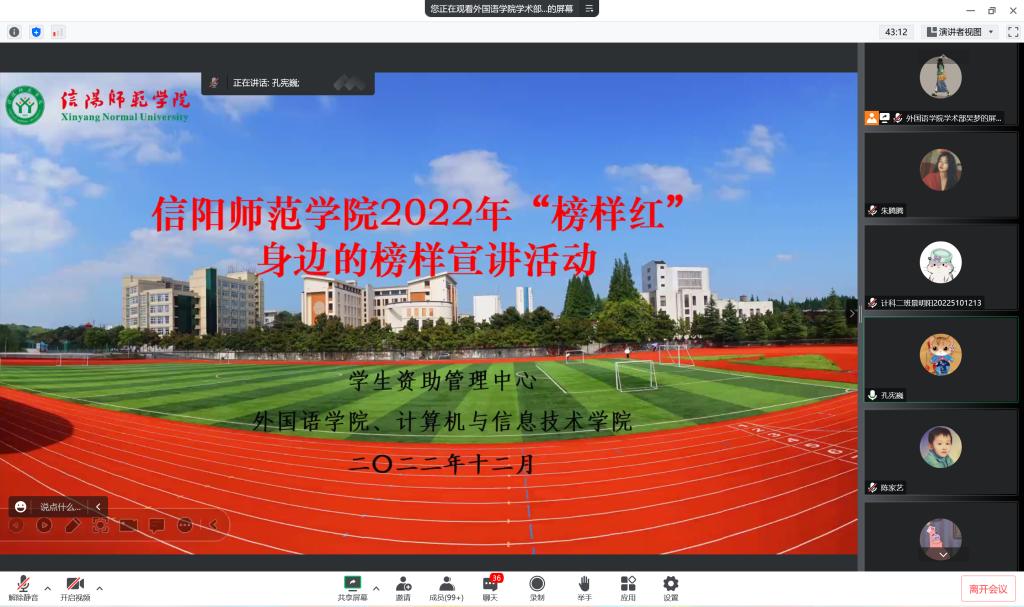 为深入推进资助育人工作,发挥榜样示范引领作用,助力广老员工成长成才,12月2日晚,伟德BV官网、计算机与信息技术公司联合开展“榜样红·身边的榜样”宣讲活动,计算机与信息技术公司刘世翔、公司孔宪巍等老师及两个公司的员工代表参加了宣讲活动。