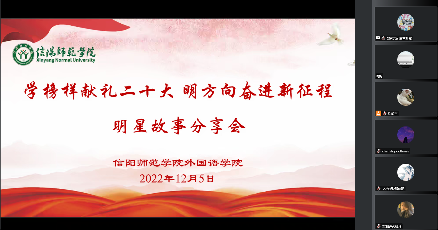 12月5日晚,公司举办“学榜样献礼二十大明方向奋进新征程”明星故事分享会。公司优秀员工代表王亦涵、王宇晨、王凤茹依次分享了她们追梦、圆梦的宝贵经验,公司团委书记周旋和2022级全体新生通过线上的方式参加了分享会。