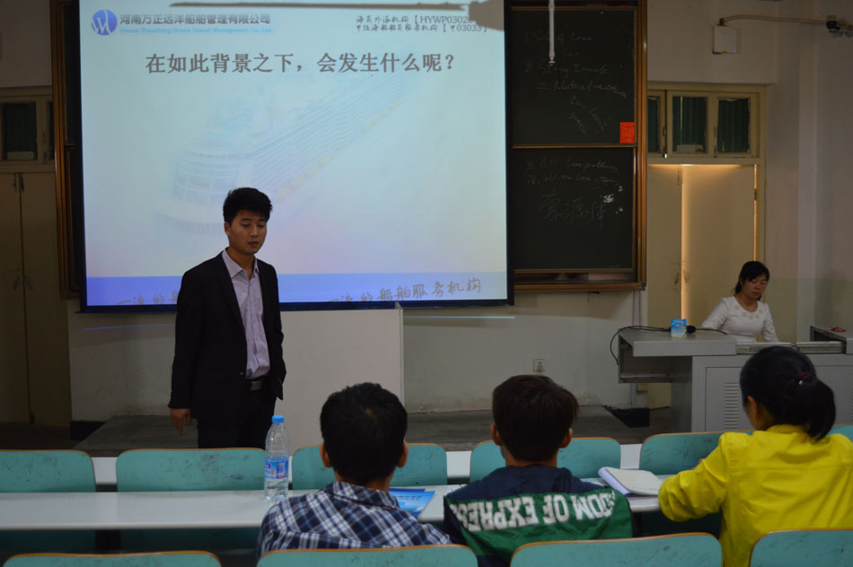 10月9日下午,人文楼209教室座无虚席,应信阳师范伟德BV官网邀请,河南万正远洋船舶管理有限公司在人文楼209教室举行了2016届毕业生专场招聘会,辅导员陈龙出席现场,近百名学子到场聆听。招聘会由陈龙主持。