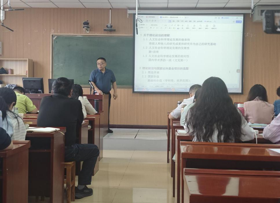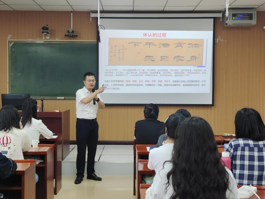 贵州师范大学博士生导师、张凌教授以“体认翻译学理论前沿、应用实践及论文写作指导”为题,结合英汉译例,重点阐释了体认翻译学的理论框架、研究方法与国家社科基金项目申报的相关问题。张凌认为,国家社科基金项目是学者学术身份的核心标识、学术生命的重要载体和学科发展的战略支点,科研工作者应以战略眼光精准定位项目价值,努力实现学术产出与社会服务的双向赋能。