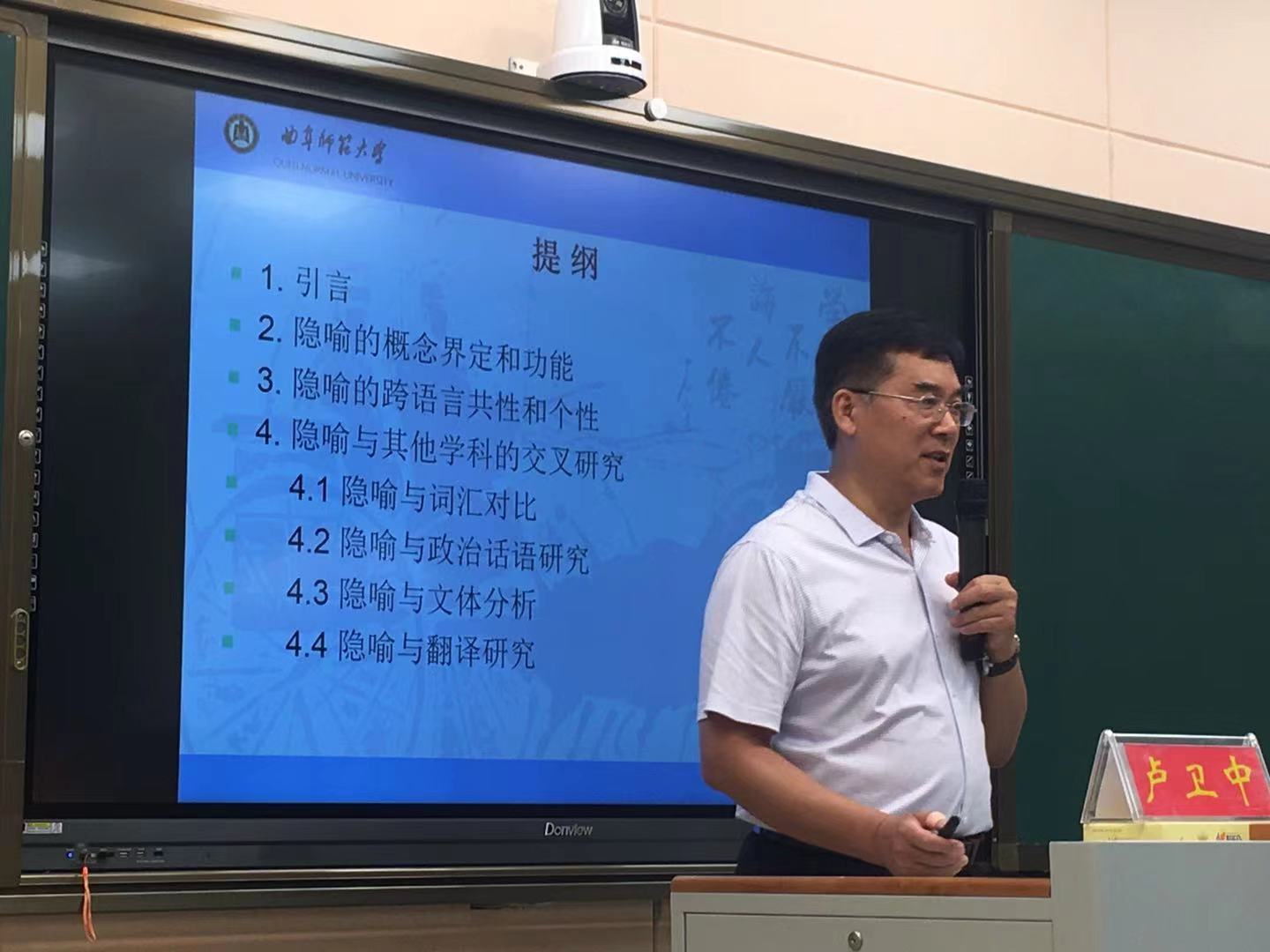 6月29日上午,应伟德BV官网邀请,曲阜师范大学翻译公司经理卢卫中教授在人文楼603教室作了题为“隐喻的跨学科研究”的学术报告,伟德BV官网全体研究生和部分教师聆听了报告。报告会由伟德BV官网经理蔡满园主持。