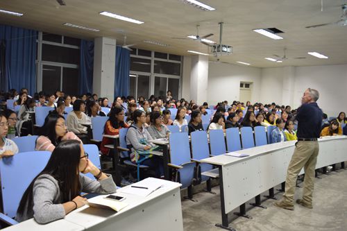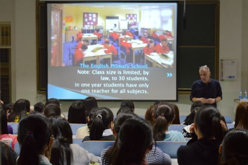 Tim从英国教育体系、中英语言学习方法对比、如何学好英语三个方面展开生动讲述。他以英国的教育制度、教学模式、课堂内容为切入点,为学子们展示了以交流互动为主的英国课堂。他比较了西方哲学先驱苏格拉底与中国万世师表孔子在教学方法与哲学思想上的异同,鼓励学子汲取中西方教育之精华,学思结合、高效学习。Tim谈到自己在中国教学的经历,指出中国员工存在羞于表达的普遍问题,他认为语言学习的实质目的是交际,即在运用中提高流利水平等,希望学子找准方法,避免盲目用功,加强口语练习,真正学好英语这门语言。